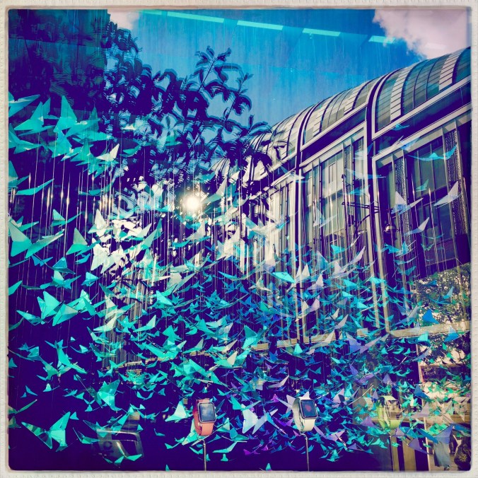 This spring we watched the weekly PBS presentation of Mr. Selfridge. I imagine that Harry Selfridge would approve of this display for the Apple iWatch. I love how all the elements of this design — the butterflies changing color and suspended from thin filaments, the watches on pedestals rising from the bottom — meld with the reflections of sky and the wonderful glass building across the street to create something quite fanciful.